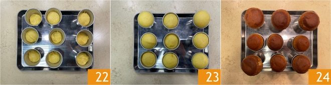 Con estas cantidades obtendrás 10-12 babás 22. Luego deberás dejarlos levar sin cubrirlos, en el horno apagado con la luz encendida (aproximadamente 26°) hasta que hayan superado el borde del molde 23. Hornea en horno estático precalentado a 200°, durante aproximadamente 15-20 min. Te recordamos que cada horno es diferente, así que también puedes ajustarte mejor a los tiempos con un primer horneado de 2-3 babás para conocer mejor los tiempos para los siguientes. Una vez cocidos, déjalos enfriar a temperatura ambiente 24, luego desmóldalos y déjalos secar al aire incluso durante 24 horas.