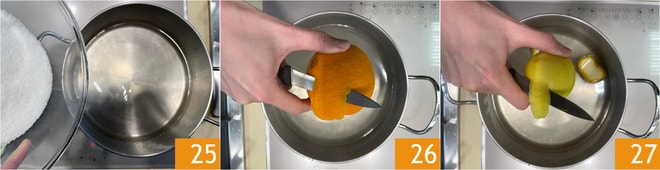 Para hacer el ponche que servirá para remojar los babás, vierte agua y azúcar en una cacerola grande 25 y lleva a ebullición. Apaga y aromatiza con cáscara de naranja 26 y limón 27.