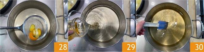Cuando el jarabe se haya templado, retira las cáscaras 28 y añade el ron a 70° 29, luego mezcla 30.