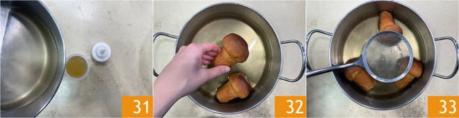 Transfiere el almíbar que habías preparado previamente en un biberón 31. Sumerge los babás en el ponche 32 y déjalos en remojo durante 2-3 minutos 33.