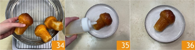 Exprime ligeramente los babás y colócalos a escurrir sobre una rejilla debajo de la cual habrás colocado una bandeja para recoger el exceso de líquido 34. Antes de servir, riega cada babá con el almíbar preparado 35 ¡y estará listo para disfrutarlo 36!