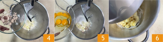 Añade la levadura desmenuzada 4 y 3 huevos fríos del frigorífico, poco a poco 5. Comienza a amasar a velocidad media-baja: la masa deberá absorber completamente los huevos 6.