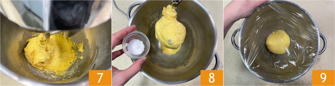 Añade la sal siempre con la amasadora en funcionamiento 7, luego amasa durante otros 5-10 minutos aproximadamente. Una vez que la masa se haya formado 8, retírala del gancho y dale forma esférica, cúbrela con papel film y deja que leve durante aproximadamente 2 horas, lejos de corrientes de aire. Deberá duplicar su volumen.