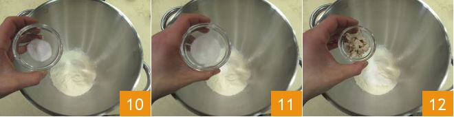 agregue la sal 10, el azúcar 11 y la levadura fresca desmenuzada 12 y comience a mezclar a velocidad media.