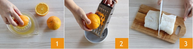 Para realizar el bacalao a la naranja, primero exprime el zumo de naranja 1 y ralla la cáscara 2. Toma el bacalao desalado y córtalo en cuatro partes 3.