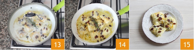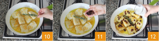 Sazona con una ramita de romero 10 sala y añade las pasas 11. Continúa la cocción para reducir el jugo a fuego medio durante unos 3 minutos, luego vierte la nata 12.