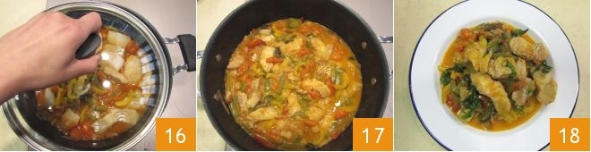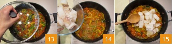 luego cubre con la tapa 13 y cocina a fuego medio durante unos 20 minutos. Pasados 20 minutos, añade el bacalao 14 y mezcla suavemente para evitar que se rompa 15.