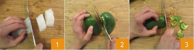Para preparar el bacalao con pimientos, primero corta los filetes de bacalao ya desalado en trozos grandes 1, luego prepara los otros ingredientes que necesitarás para la receta: divide el pimiento verde por la mitad 2 y elimina las semillas y los filamentos internos, luego córtalo en tiras 3. Haz lo mismo con los otros pimientos: en total necesitarás 150 g.