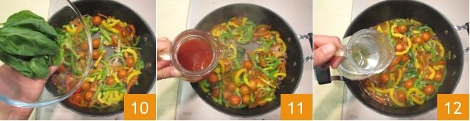 y las hojas de menta y albahaca 10. Añade una pizca de sal, vierte el vino con el concentrado de tomate 11 y el agua 12,