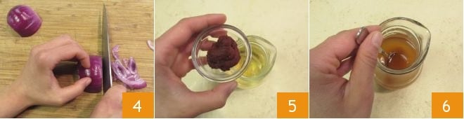 Limpia la cebolla y córtala en rodajas finas 4. Vierte el concentrado de tomate en el vino blanco 5 y mezcla con una cucharilla para disolverlo completamente 6. Deja los tomatitos enteros.