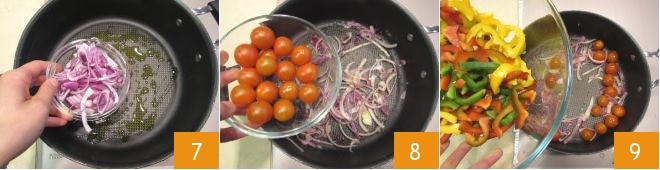 Ahora calienta el aceite en una cacerola, añade la cebolla 7 y fríela brevemente, luego añade los tomatitos 8, los pimientos 9,