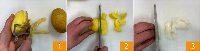Para preparar el bacalao guisado, lo primero que hay que hacer es pelar las patatas 1 y cortarlas en cubos de unos 3 cm 2. Limpiar y cortar finamente la cebolla 3.