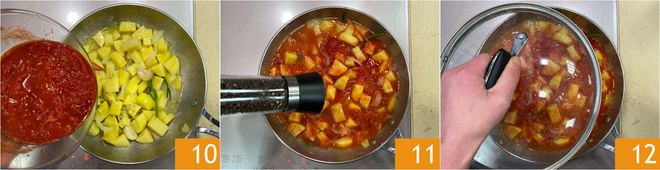Ahora añadid los tomates pelados triturados 10, mezclad y ajustad de sal y pimienta 11. Cubrid con tapa 12 y coced durante 30 minutos a fuego medio, removiendo de vez en cuando, o hasta que las patatas estén tiernas.