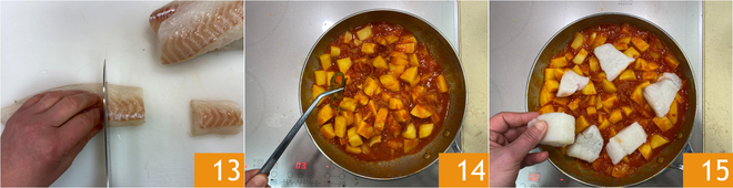 Mientras tanto, cortad los filetes de bacalao en trozos más pequeños 13, eliminando cualquier espina. Pasados los 30 minutos, retirad los tallos de perejil y el ajo de la sartén 14, luego colocad el bacalao 15.
