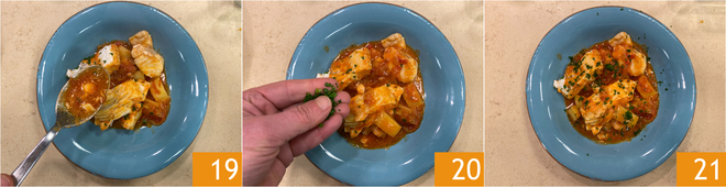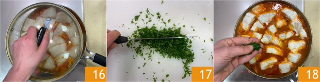 Cubrid nuevamente con una tapa 16 y coced durante otros 20 minutos o hasta que el pescado esté cocido. Mientras tanto, picad finamente las hojas de perejil 17 y espolvoreadlas en la sartén al final de la cocción 18.