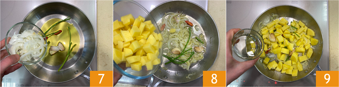 Añadid también las cebollas a la sartén 7 y sofreíd durante 7-8 minutos, hasta que las cebollas se vuelvan transparentes. Después, añadid las patatas 8 y dorad durante 5 minutos, removiendo a menudo. Desglasad con vino blanco 9 y dejad evaporar toda la parte alcohólica removiendo de vez en cuando.