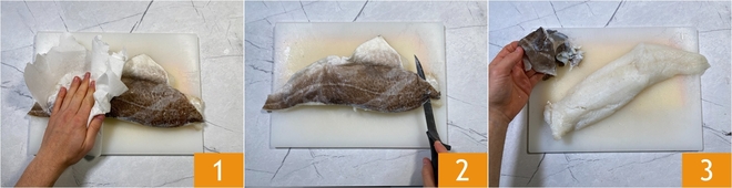 Para preparar el bacalao frito a la romana (en tempura) aseguraos de que el bacalao esté bien desalado, si no, seguid nuestra guía "Cómo desalar el bacalao". Secad el bacalao desalado con papel absorbente 1, luego quitad la piel ayudándoos con un cuchillo 2 3.
