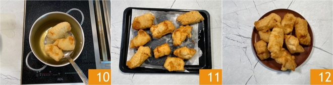 Freíd durante unos 8 minutos girando los trozos de vez en cuando y controlando a menudo la temperatura del aceite. Una vez cocidos, escurridlos sobre papel absorbente 11 y sazonad con una pizca de sal. ¡Vuestro bacalao frito a la romana (en tempura) está listo para ser disfrutado 12!