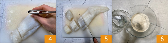 Quitad también las espinas con unas pinzas 4. Luego cortad el bacalao en 8 trozos aproximadamente del mismo tamaño 5 y reservadlos un momento. En un bol, verted la harina y el agua con gas poco a poco 6.