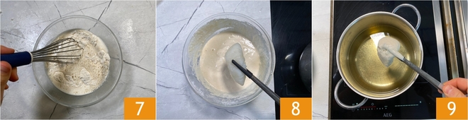 Mezclad con la varilla 7 hasta obtener una tempura densa y que cubra bien. Calentad el aceite de semillas en una olla amplia y de doble fondo; cuando haya alcanzado una temperatura de 190° será el momento de freír. Sumergid 2-3 trozos de bacalao en la tempura 8 y enseguida ponerlos en el aceite 9.