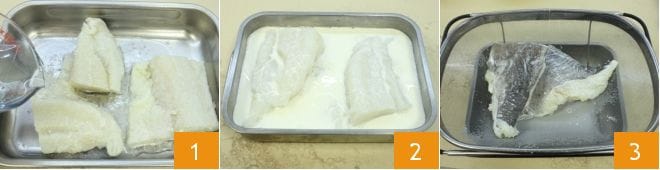 Para realizar el bacalhau à Braz, comienza desalando el bacalao: ponlo en agua fría durante aproximadamente 24 horas, teniendo cuidado de cambiar el agua 3-4 veces 1, el último remojo hazlo con leche que además de suavizar el pescado lo endulzará 2. Si usas bacalao ya remojado, déjalo una hora en remojo en leche. Transcurrido el tiempo indicado, escurre el bacalao 3, despéjalo y quítale las espinas (para facilitar esta operación, sumerge el pescado unos minutos en agua caliente).