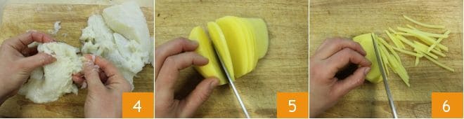 Desmenuza el bacalao con las manos 4 y reserva la pulpa. Lava, pela las patatas y luego córtalas primero en rodajas 5 y luego en bastones finos de 3 mm 6.