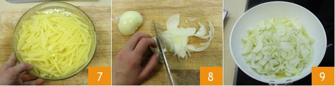 Pon las patatas en un bol lleno de agua fría para que no se oscurezcan 7. Pica el ajo y corta finamente las cebollas blancas 8, viértelas junto con el ajo en una sartén con aceite y cocina a fuego muy lento 9 durante al menos 10-15 minutos, tienen que volverse cremosas y no deben tomar color, si es necesario añade una cucharada de agua caliente.