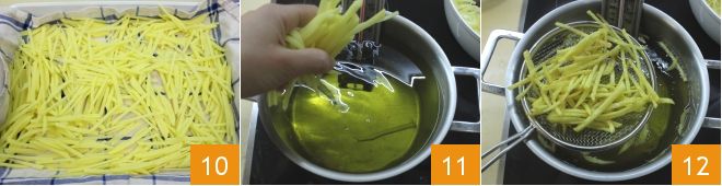 Mientras tanto, escurre las patatas y sécalas en un paño de cocina 10, luego fríelas en abundante aceite de semillas, cuidando de que el aceite mantenga una temperatura de 170°-180° 11. Cocina las patatas pocas a la vez durante unos minutos, luego escúrrelas 12,