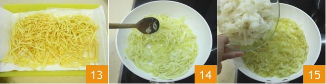 déjalas secar en una bandeja cubierta con papel absorbente 13 y mantenlas calientes. Mientras tanto, las cebollas habrán terminado de cocinarse y estarán suaves 14, agrega el bacalao en trozos 15 y cocina por unos minutos.