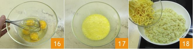 Mientras tanto, aparte bate los huevos con sal y pimienta (16-17). Vierte las patatas fritas en la sartén con el bacalao 18, mezcla con una cuchara y apaga el fuego.