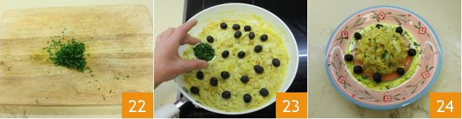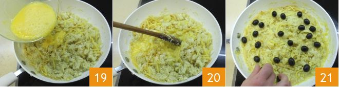 Agrega también los huevos batidos 19 y mezcla nuevamente con una cuchara de madera 20 para incorporar bien los huevos que deben permanecer cremosos (alternativamente, puedes transferir la mezcla a un bol y luego agregar los huevos para que no se cuajen). Decora con las aceitunas negras 21;