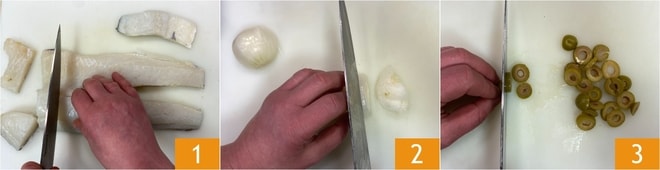 Para preparar el bacalao a la ghiotta, primero corta el bacalao desalado en trozos, sin quitar la piel 1. Limpia la cebolla y córtala finamente 2, luego corta las aceitunas en rodajas 3.