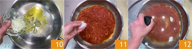 Mientras tanto, en otra sartén grande, sofríe la cebolla con un poco de aceite 10, luego vierte la pulpa de tomate y sala 11. Cubre con la tapa 12 y cocina a fuego lento durante 15 minutos.