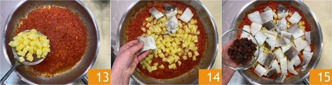 Después de este tiempo, añade las patatas 13, los trozos de bacalao 14 y las pasas 15.