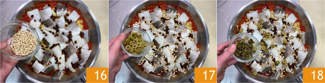 Agrega también los piñones 16, las aceitunas 17 y las alcaparras desaladas 18.