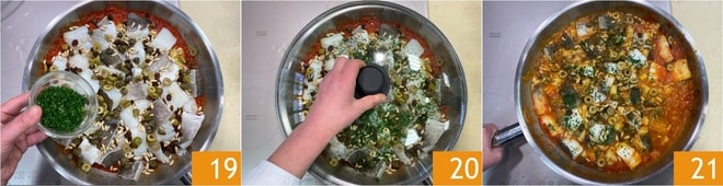 Aromatiza con el perejil picado 19, luego cubre con la tapa 20 y continúa cocinando durante otros 15 minutos, siempre a fuego lento 21.