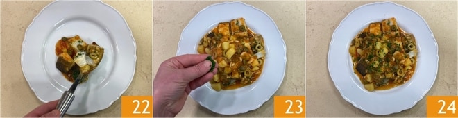Transcurrido el tiempo de cocción, emplata 22 y decora con un poco de perejil picado 23 antes de servir tu delicioso bacalao a la ghiotta 24!