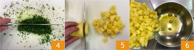 Enjuaga las alcaparras para eliminar la sal y pica finamente el perejil 4. Finalmente, pela y corta las patatas en cubos 5. Calienta un poco de aceite en una olla grande, luego añade las patatas 6.