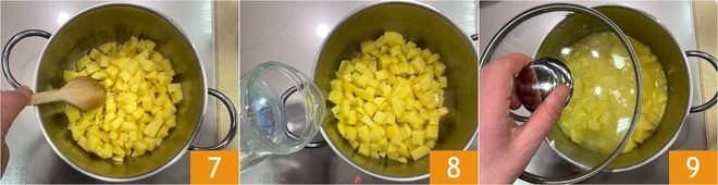 Dora las patatas durante unos minutos 7, luego vierte un cucharón de agua 8. Cubre con la tapa 9 y cocina a fuego medio durante unos 10-15 minutos, o hasta que estén tiernas 9.
