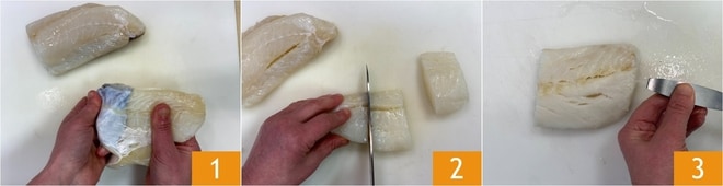 Para preparar el bacalao en freidora de aire, primero elimine la piel del bacalao 1, luego divida el filete en trozos de aproximadamente 4 cm 2. Finalmente, elimine las espinas con unas pinzas 3.