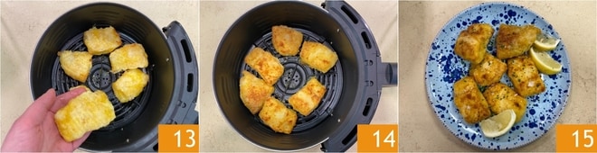 Condimente los filetes de bacalao empanados con un hilo de aceite en ambos lados 10. Colóquelos en la cesta de la freidora de aire (utilizamos una freidora con una capacidad de 6 litros) 11 y cocine a 180° durante un total de 15 minutos 12.