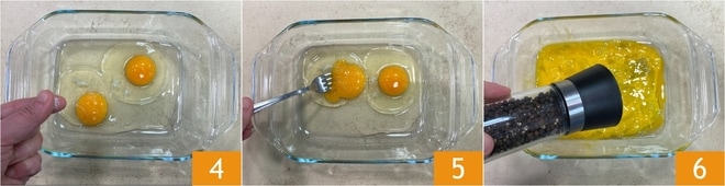 Rompa los huevos en un bol, salpimiente 4 y bata con un tenedor 5. También agregue la pimienta 6.
