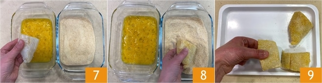Sumergir los filetes de bacalao en la mezcla de huevos 7, luego recúbralos con el pan rallado 8 y colóquelos en una bandeja 9.