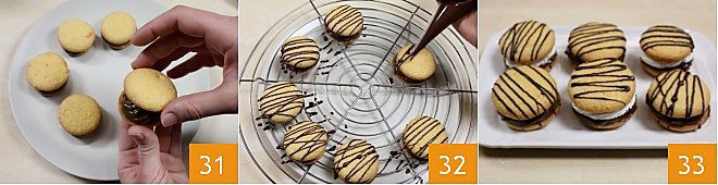 Ahora poned sobre cada mitad rellena las otras galletas restantes para crear vuestros bacetti 31. Luego transferidlos a una rejilla y terminadlos con chocolate fundido realizando pequeñas líneas de decoración sobre cada bacetto ayudándoos con un cono de papel 32. Para realizar un cono de papel podéis consultar la hoja de la escuela de cocina: cómo hacer un cono de papel de horno. Si os apetece, podéis montar un poco de nata fresca líquida con azúcar glas y rellenar vuestros bacetti con la nata montada, además de la crema de café, para hacerlos aún más suaves y sabrosos 33!