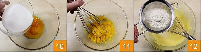 Mientras las galletas se enfrían, empezad a preparar la crema para rellenarlas: en un bol grande poned los huevos y el azúcar 10 y mezclad con una batidora manual 11 o una batidora eléctrica hasta obtener una crema clara y espumosa. Luego añadid la harina 12 y continuad mezclando bien los ingredientes.