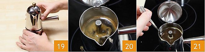 No presionéis con la cucharilla, ni hagáis agujeros y atornillad bien la cafetera 19 (para evitar que el café salga por los lados mientras sube), luego ponedla en una llama baja y constante, para obtener un café con cuerpo. A medida que el café sube se formará una espumilla densa 20; aconsejamos no dejar que burbujee demasiado tiempo para mantener intactos el aroma y la dulzura. Luego apagad el fuego y vuestro café para usar en la preparación está listo: mezcladlo directamente en la moka con una cucharilla, para hacerlo más homogéneo 21.