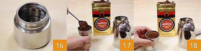 Pasad entonces a preparar el café para añadir luego a la crema: poned el agua fría, preferiblemente baja en cal, dentro de la caldera hasta la válvula de seguridad 16 (de lo contrario obtendréis un café más largo). Llenad el filtro con el café molido 17 y nivelad con cada cucharadita de café añadida golpeando el filtro sobre la mesa con movimientos firmes 18, hasta alcanzar el borde del filtro.