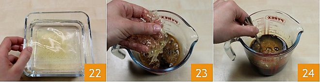 Ahora poned la gelatina a remojar en agua fría durante 10 minutos 22. Pasado el tiempo necesario, escurridla y añadidla al café recién hecho para que se disuelva, mezclando con una cucharilla (23-24).