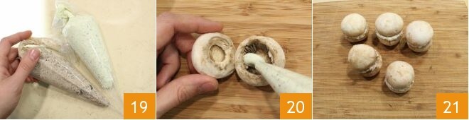 Mientras tanto, pueden ocuparse de la limpieza de los hongos, retiren el tallo girándolo suavemente, límpienlos rápidamente con agua fría y séquenlos con un paño, y peleen las tapas de los champiñones con la ayuda de un cuchillo 16: con la ayuda de un cuchillo, retiren también el borde 17 y parte del interior de los hongos, a medida que los limpian colóquenlos en una tabla de cortar. Retiren las cremas del refrigerador 18 y bátanlas rápidamente con un batidor para integrarlas de nuevo;