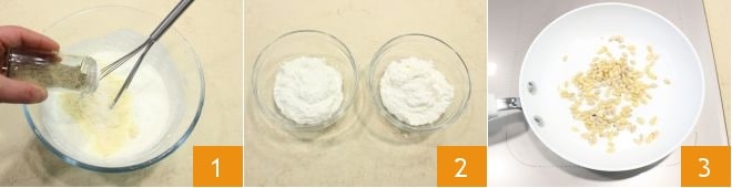 Para preparar los baci de champiñones, comiencen con la crema de relleno: coloquen la ricotta en un bol y batan todo con un batidor hasta obtener una crema lisa sin grumos. Sazonen con Parmesano rallado, sal y pimienta 1 y mezclen para integrar los ingredientes. Dividan la crema en dos boles diferentes 2. Tuesten los piñones unos segundos en la sartén 3 para dorarlos y hacerlos más crujientes,